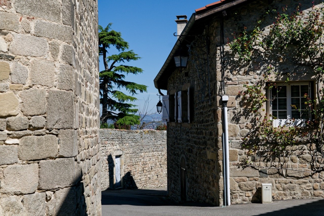 Et au milieu… le Vieux Montagny, ancien centre-bourg qui surplombe la vallée avec une vue dégagée jusqu’à Lyon (et le village moderne est en contre-bas).